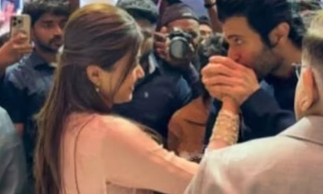 முன்னதாக, நிகழ்ச்சியில் பங்கேற்க வந்த விஜய் தேவரகொண்டா, ராஷ்மிகாவுடன் கைகுலுக்கும் போது அவரது கையை பிடித்து முத்தமிட்டது தொடர்பான வீடியோவும் சமூக வலைத்தளங்களில் வைரலாகி வருகிறது. இருவரும் முதல் முறையாக பொது நிகழ்வில் தங்களது காதலை வெளிப்படுத்தி உள்ளதாக ரசிகர்கள் கூறி வரும் நிலையில், இந்த ஜோடியின் ரசிகர் பட்டாளம் இந்த வீடியோவை ஷேர் செய்து வைரலாக்கி வருகின்றனர்.