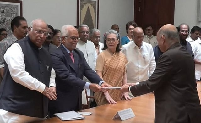 இந்தியா கூட்டணி சார்பில் போட்டியிடும் B. சுதர்சன் ரெட்டி, காங்கிரஸ் மூத்த தலைவர் சோனியா, கார்கே முன்னிலையில், தனது வேட்பு மனுவை தாக்கல் செய்தார். கூட்டணி கட்சிகள் சார்பில் சரத் பவார், திருச்சி சிவா, ராம் கோபால் யாதவ், சஞ்சய் ராவ் உள்ளிட்டோர் இதில் பங்கேற்றனர்.