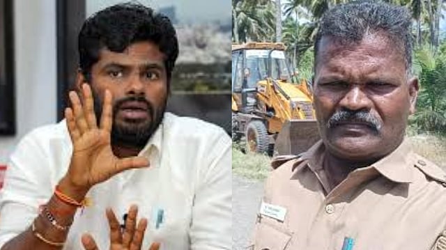 Annamalai on Tiruppur SI Shanmugavel Murder : திருப்பூர் மாவட்டம் உடுமலைப்பேட்டை அருகே மூங்கில் தொழுவு கிராமத்தில் மடத்துக்குளம் எம்எல்ஏ மகேந்திரனுக்கு சொந்தமான தோட்டம் இருக்கிறது. இங்கு பணியாற்றி வந்த மூர்த்தி அவரது மகன் தங்கபாண்டியன் ஆகியோர் நேற்றிரவு குடிபோதையில், குடும்ப பிரச்சினை காரணமாக வாக்குவதத்தில் ஈடுபட்டனர். ஒரு கட்டத்தில் அது மோதலாக வெடிக்க, மூர்த்தியை தங்கபாண்டியன் தாக்கினார். இதைபார்த்து, காவல்நிலையத்திற்கு அப்பகுதி மக்கள் தகவல் தெரிவிக்க, ரோந்து பணியில் ஈடுபட்டு இருந்த சிறப்பு எஸ்ஐ சண்முகவேல் அங்கு விரைந்தார்.