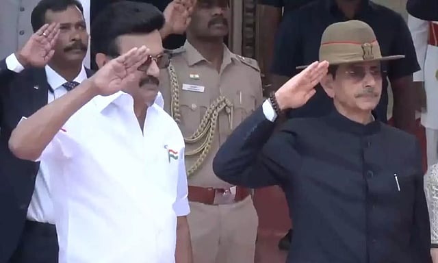 இந்த நிகழ்ச்சியில், காலை 8:00 மணி அளவில் ஆளுநர் ரவி தேசியக்கொடியை ஏற்றினார். விழாவில், முதல்வர் ஸ்டாலின், அமைச்சர்கள், தலைமை செயலர், நீதிபதிகள் மற்றும் அதிகாரிகள் பங்கேற்று தேசிய கொடிக்கு வீரவணக்கம் செலுத்தினர். முன்னதாக ஆளுநர் ரவியை முதல்வர் ஸ்டாலின் பூங்கொத்து கொடுத்து வரவேற்றார்.